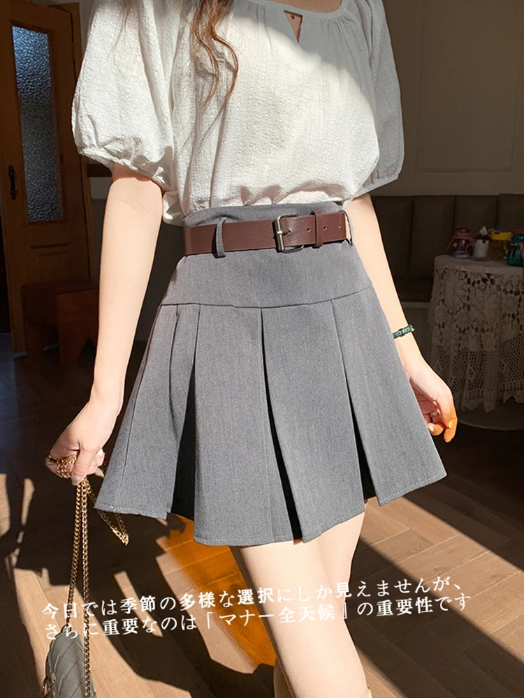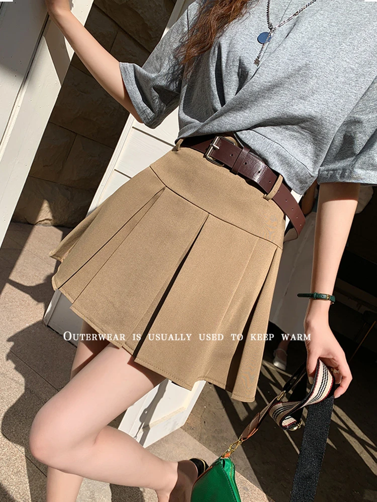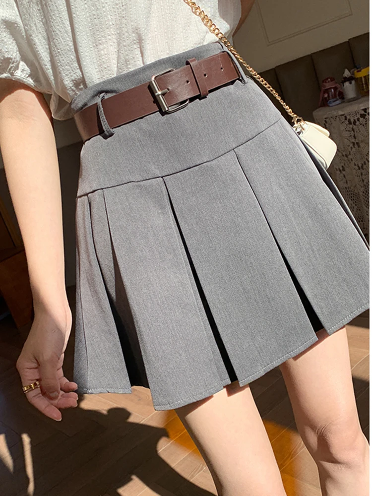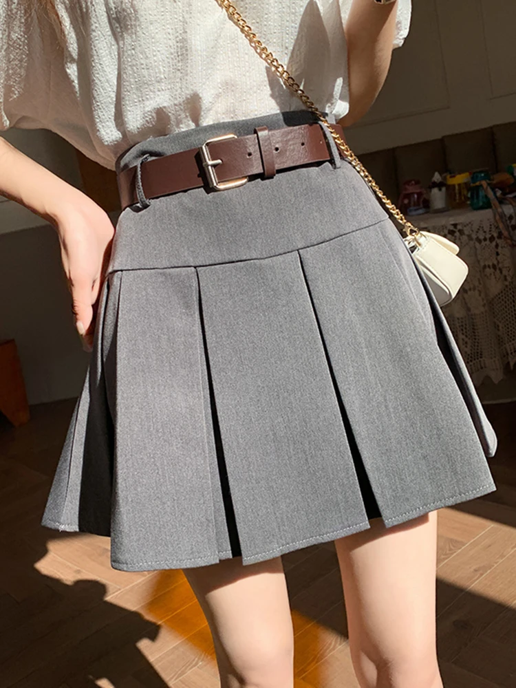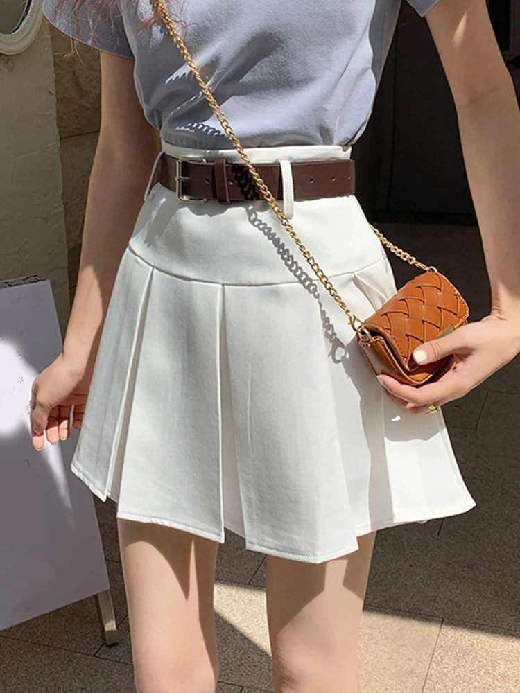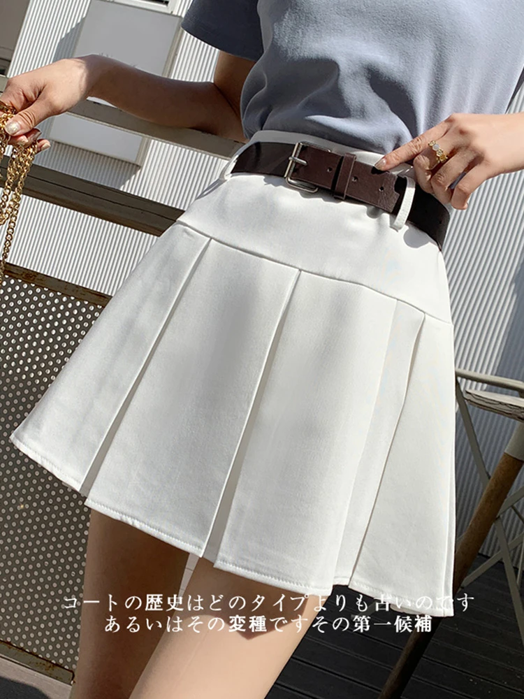 High Waist Women Skirt Summer Harajuku Solid Casual Mini Short Skirt Ladies Vintage Slim A-Line Pleated Skirts Belt Female