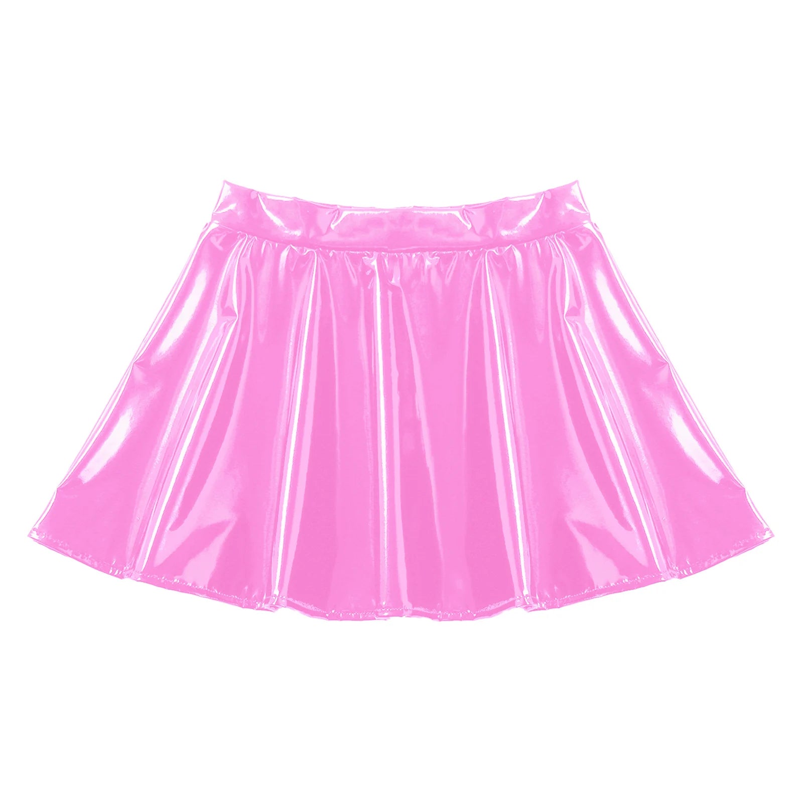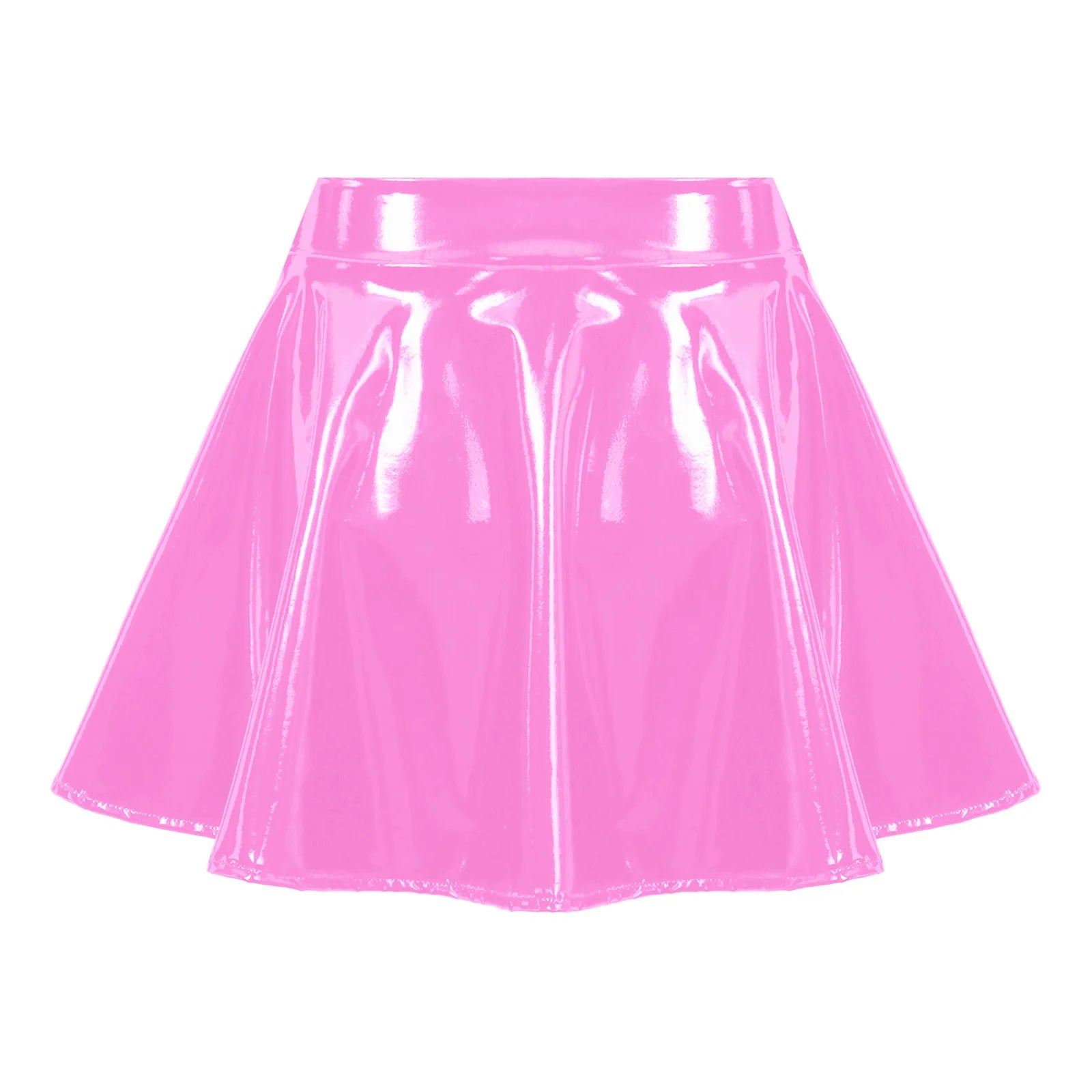 Womens Glossy Patent Leather Flared Skirt Invisible Zipper A-Line Mini Skirts.